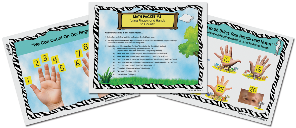 Counting becomes an adventure as children explore numbers using their fingers, hands, toes, and even their nose with Safari Math Adventures #4 – Using Finger and Hands to Count!